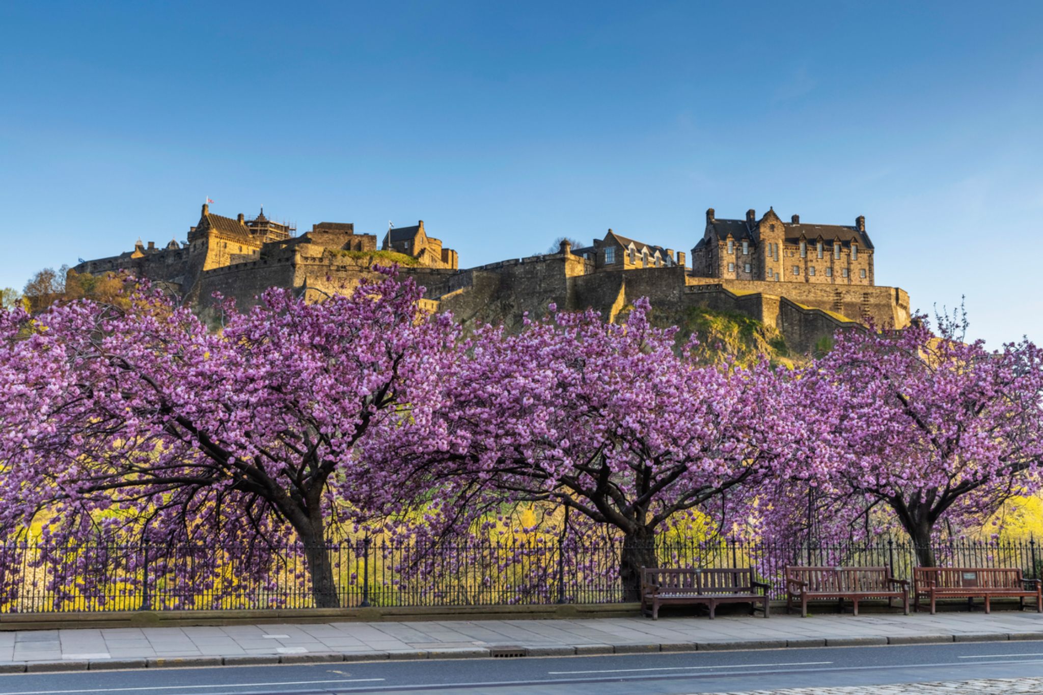 Castello di Edimburgo con alberi di ciliegio in fiore visti da Princes Street