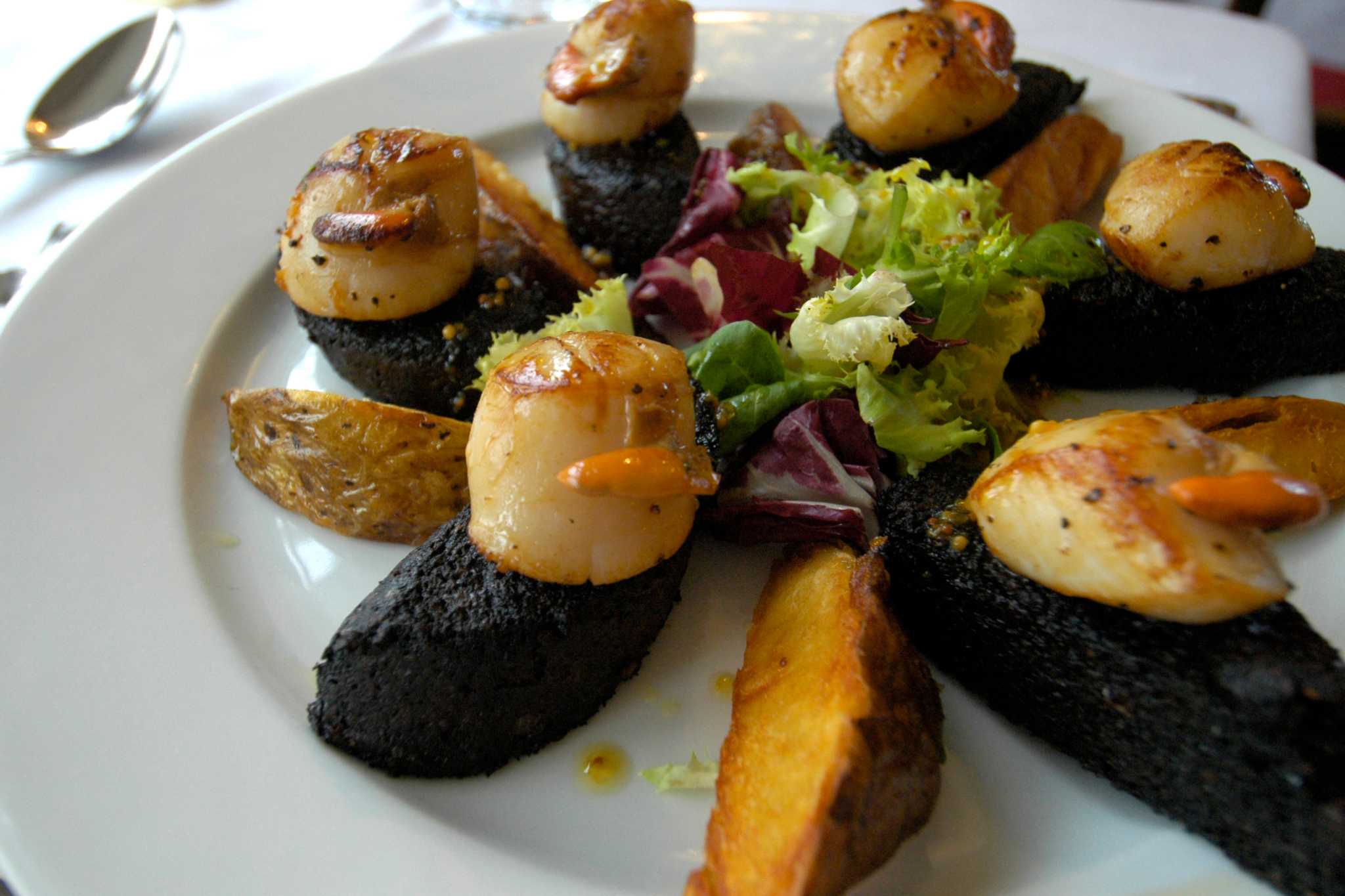 Seared Skye hand-dived scallops on Stornoway black pudding, The Cluanie Inn