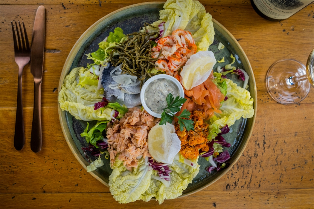 Scottish seafood platter with herring, smoked trout pate, prawns, samphire and salad leaves.