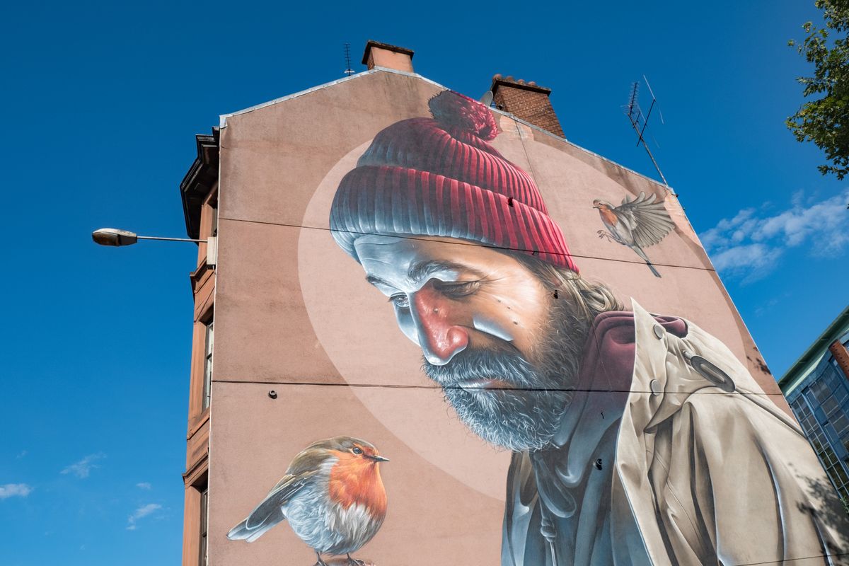 A mural by Smug depicts St Mungo and the tale of The Bird That Never Flew
