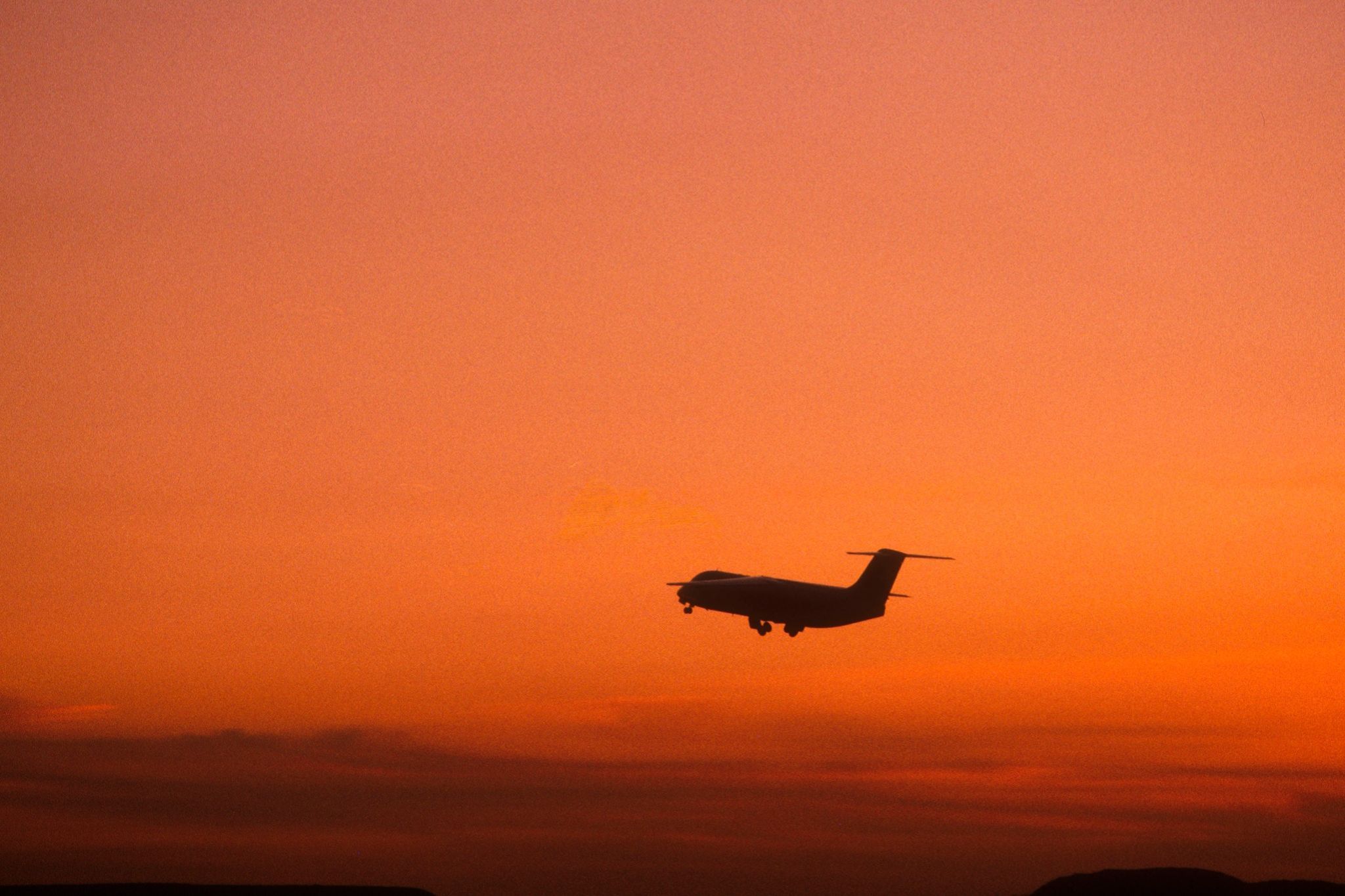 An aeroplane takes off into the sunset from Edinburgh Airport