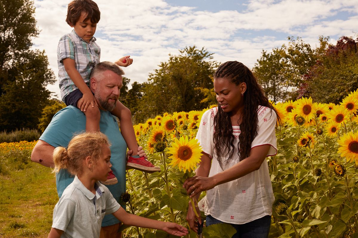 A family at Cairnie Fruit Farm during sunflower season, Cupar
